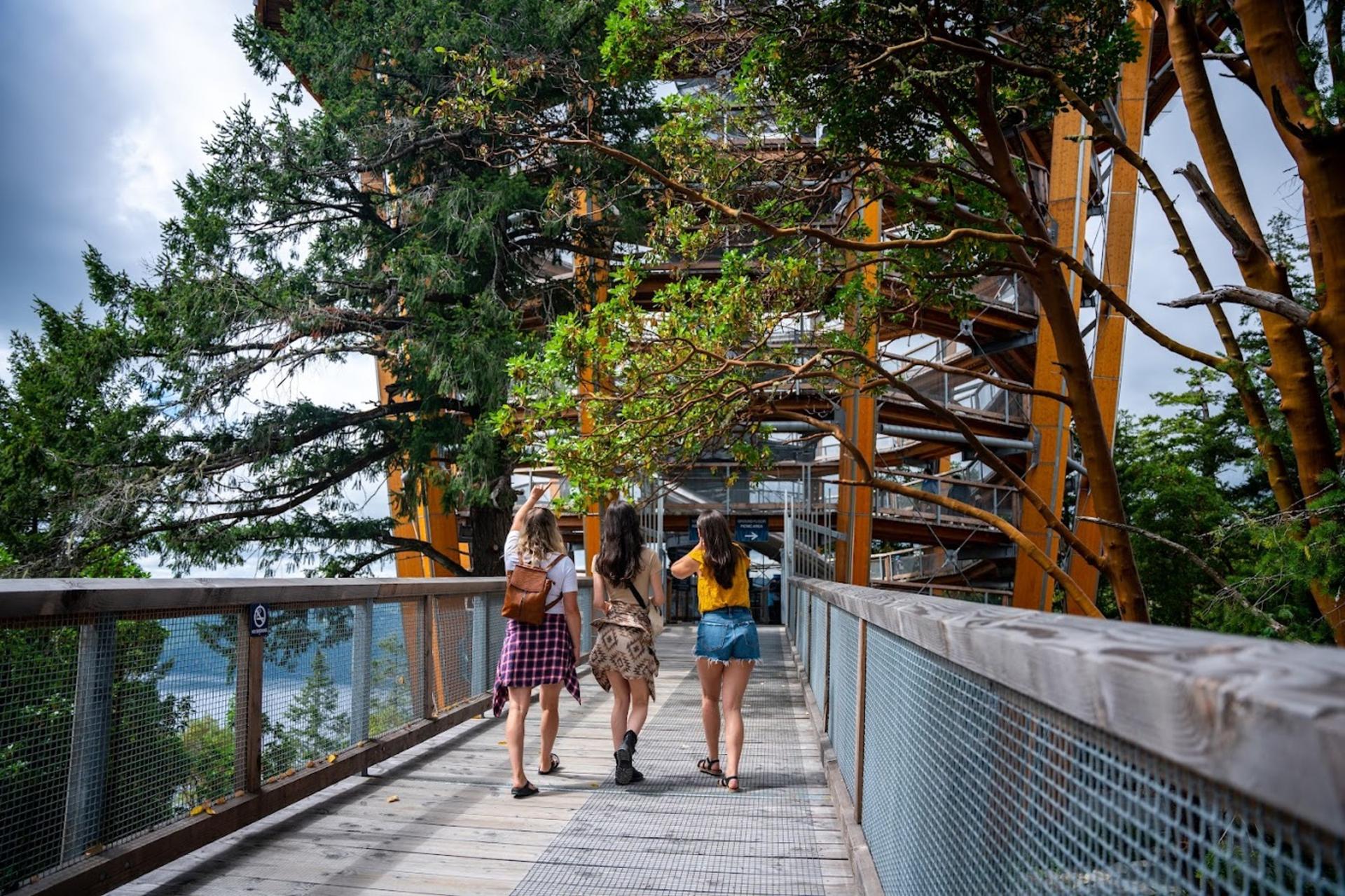Malahat SkyWalk is an accessible 600m TreeWalk through a beautiful arbutus forest leading to a spectacular gentle spiral ramp that takes up to 32m to a sightseeing lookout offering views of Finlayson Arm, Saanich Peninsula, Mount Baker and the distant Coastal Mountains.